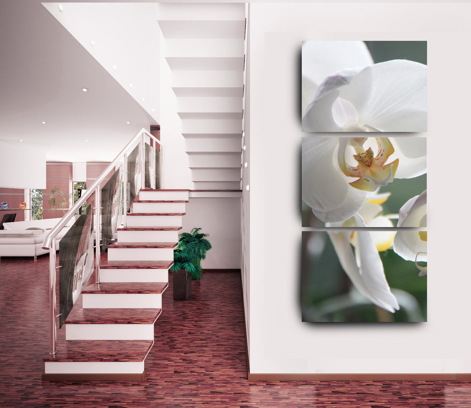 Quadro 3 Telas Orquídea Decorativo Vertical Impresso em Tecido Poliester 60x120cm